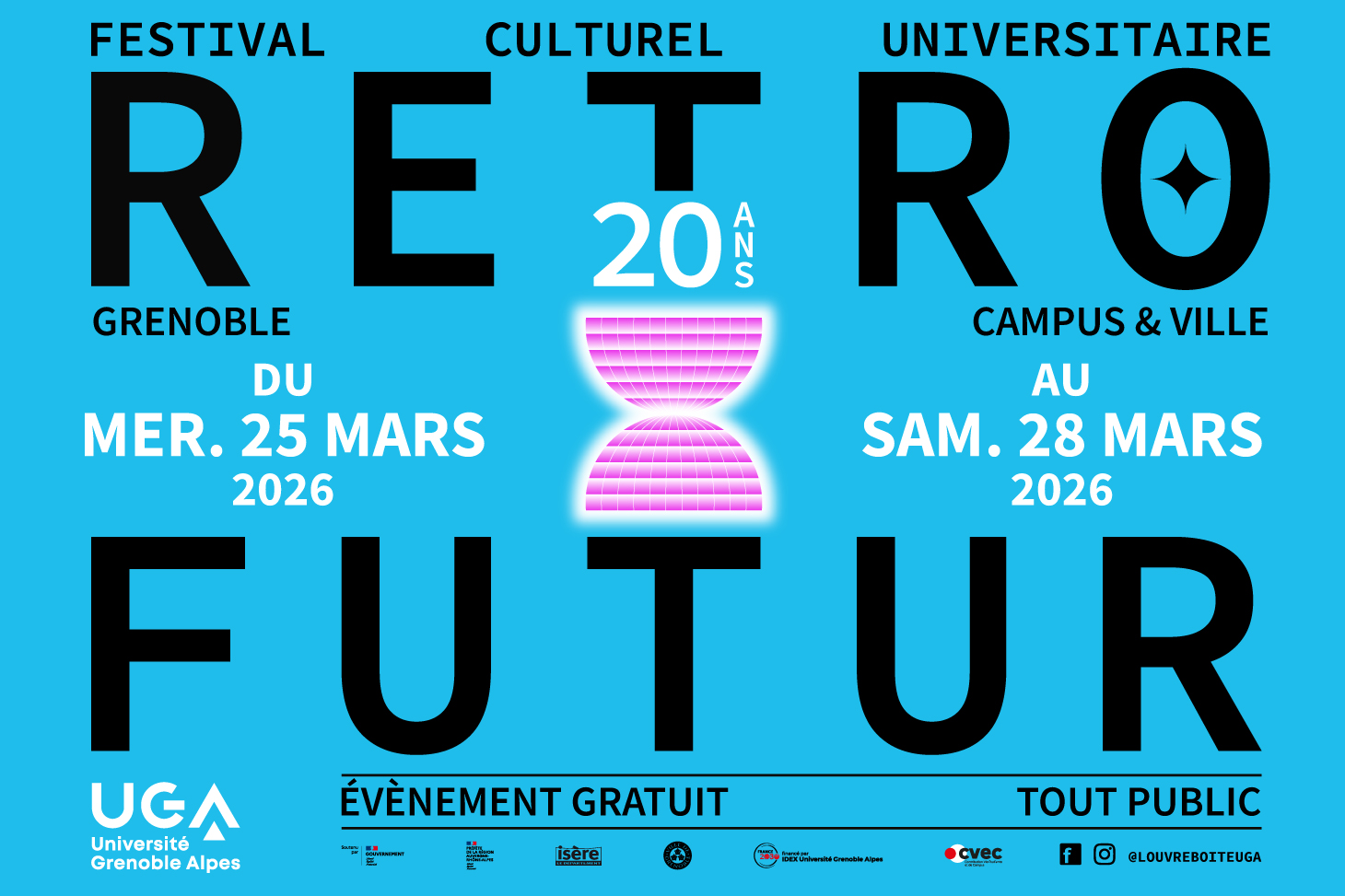 Depuis sa création, le Festival culturel universitaire s'est imposé comme un temps fort de la vie culturelle grenobloise, mettant à l'honneur la création artistique étudiante, la rencontre entre disciplines et l'ouverture au grand public, dans un esprit de partage et de gratuit. Pour cette édition particulière, du 25 au 28 mars, ce festival historique de l'Université Grenoble Alpes se déploiera autour du thème Rétro-futur, mêlant mémoire, innovation et regard porté vers demain. Cette édition anniversaire proposera expositions, performances, cinéma, concerts et événements festifs, avant la participation d'étudiants et étudiantes, d'artistes confirmés et d'anciens participants devenus professionnels.