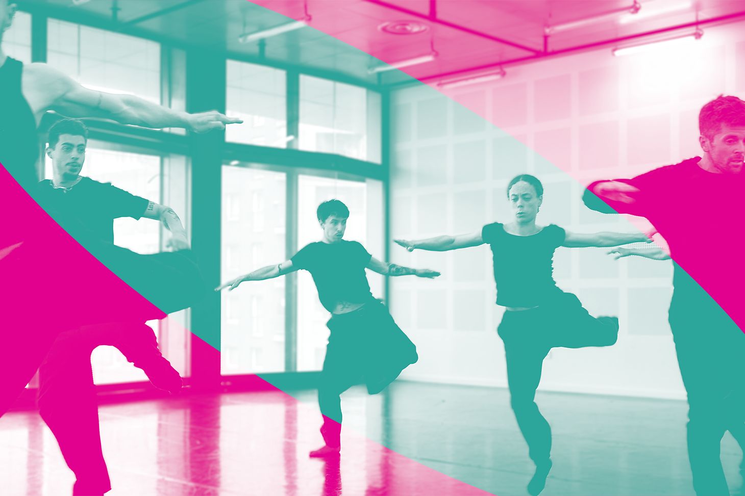 corps des sept danseuses et danseurs questionnent leurs appuis et défient la gravité dans une danse intense.